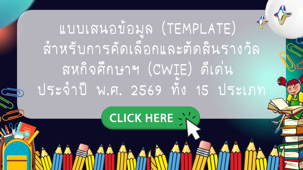 เอกสารที่เกี่ยวข้องการประกวดผลงานสหกิจศึกษาฯ (CWIE) ดีเด่น A.แบบเสนอข้อมูล (Template) สำหรับการคัดเลือกและตัดสินรางวัลสหกิจศึกษาฯ (CWIE) ดีเด่น ประจำปี พ.ศ. 2569 ทั้ง 15 ประเภท