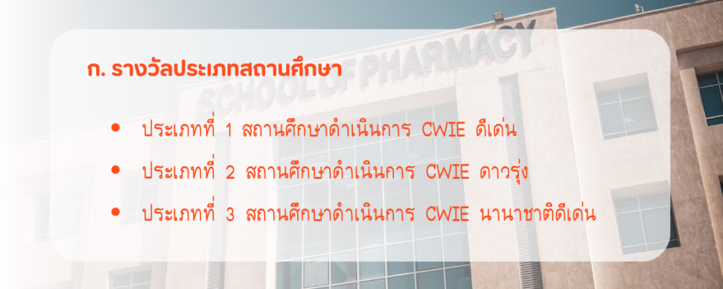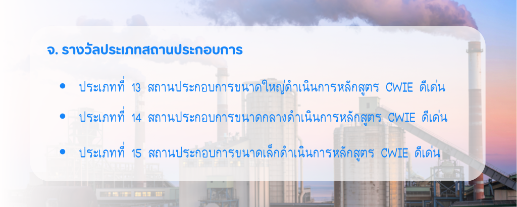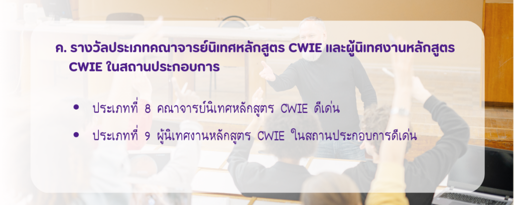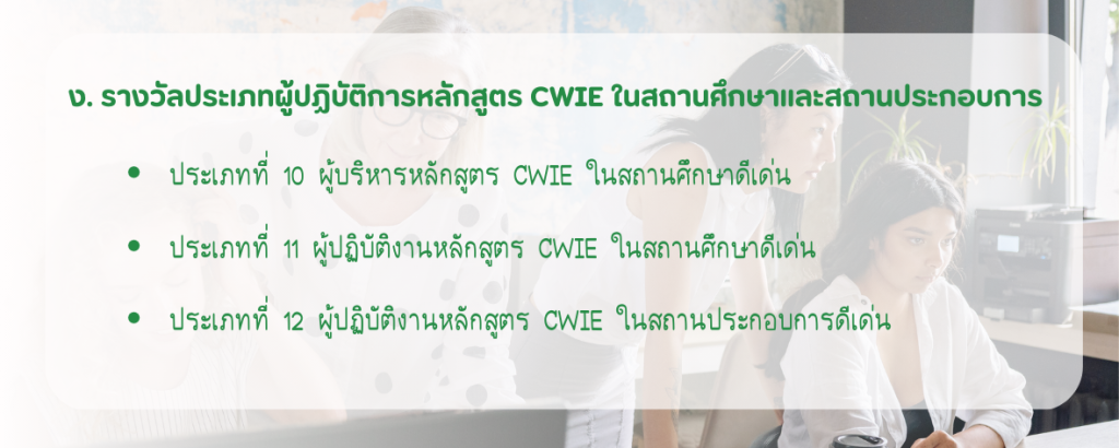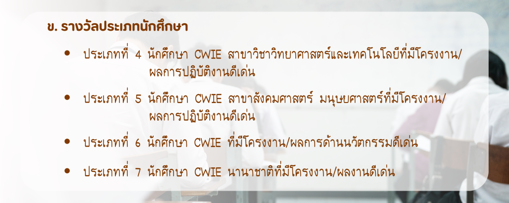 ประเภทการประกวดผลงานสหกิจศึกษาฯ (CWIE) ดีเด่น ประจำปี พ.ศ. 2569 ทั้งหมด 15 ประเภท ดังนี้